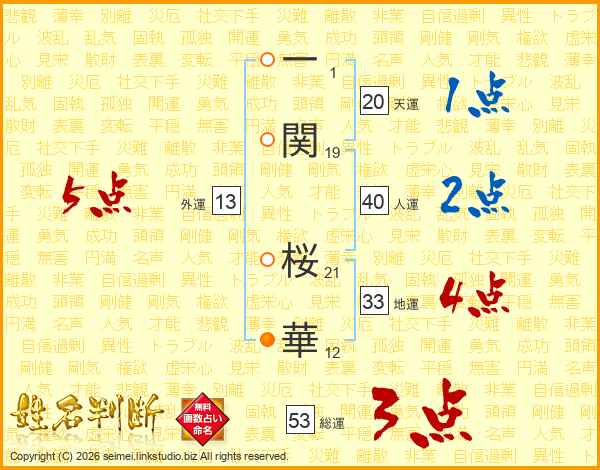 一(1画)関(19画) 桜(21画)華(12画)