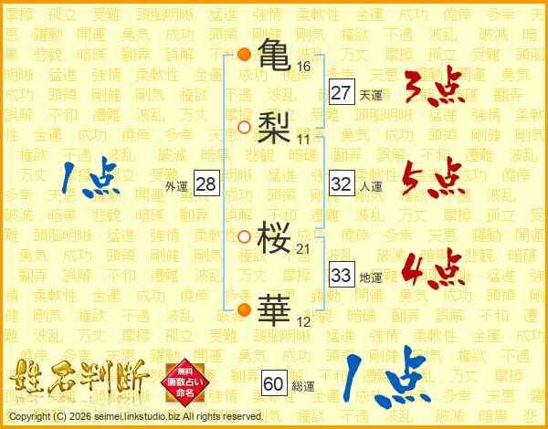 亀(16画)梨(11画) 桜(21画)華(12画)