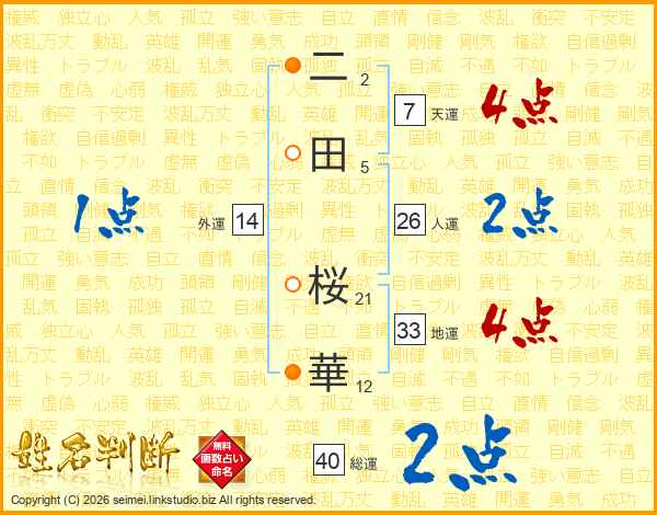 生活面を象徴する運勢です。外部から受ける影響力を表し、結婚運、家庭運や職場、環境への順応性を表します。総運から人運を引いた画数。姓や名が1文字の場合を除く。