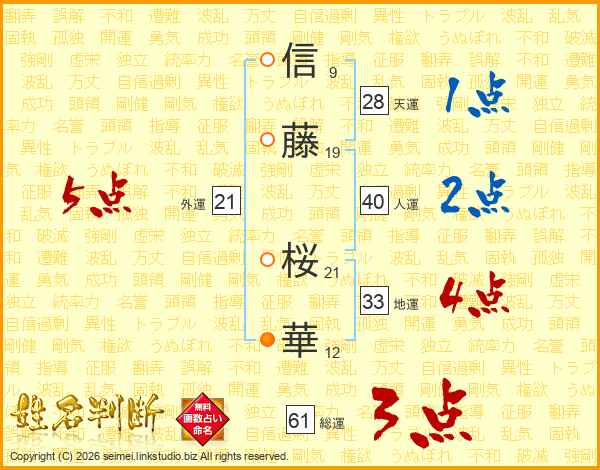 あなたの人生を表す1番重要な運勢です。生涯を通じて影響する総合運となり、主に50歳以降の晩年期に影響を及ぼします。苗字と名前の合計画数。