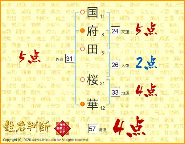 国(11画)府(8画)田(5画) 桜(21画)華(12画)