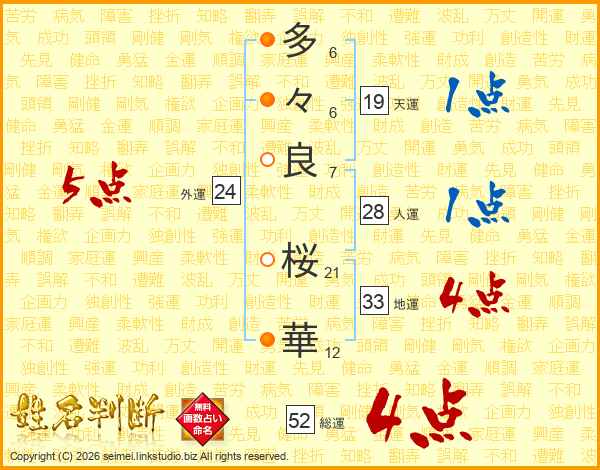 多(6画)々(6画)良(7画) 桜(21画)華(12画)