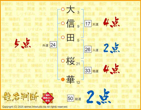 大(3画)信(9画)田(5画) 桜(21画)華(12画)