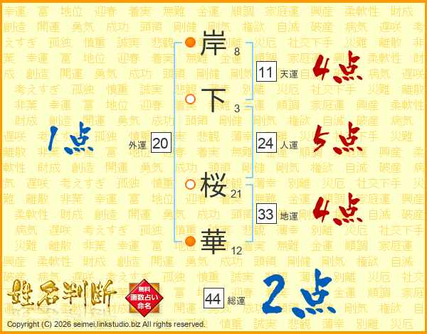 生活面を象徴する運勢です。外部から受ける影響力を表し、結婚運、家庭運や職場、環境への順応性を表します。総運から人運を引いた画数。姓や名が1文字の場合を除く。