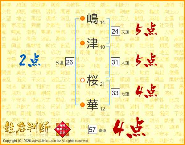 嶋(14画)津(10画) 桜(21画)華(12画)