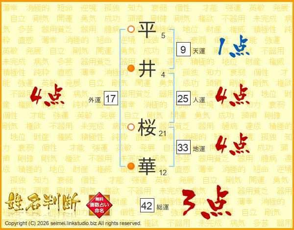生活面を象徴する運勢です。外部から受ける影響力を表し、結婚運、家庭運や職場、環境への順応性を表します。総運から人運を引いた画数。姓や名が1文字の場合を除く。