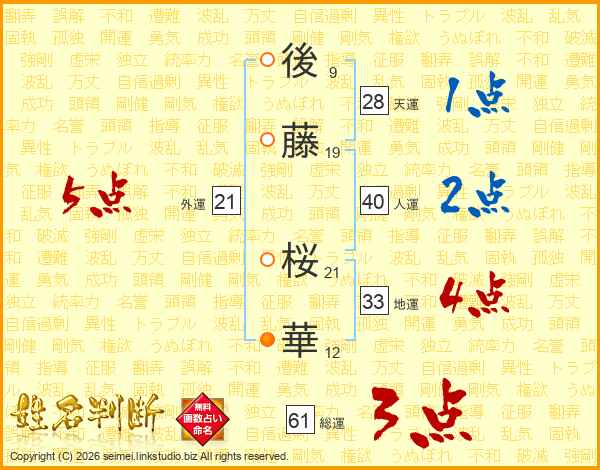 後(9画)藤(19画) 桜(21画)華(12画)