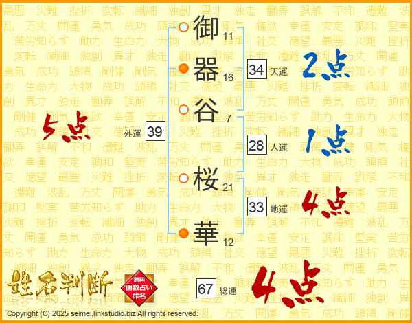 御(11画)器(16画)谷(7画) 桜(21画)華(12画)