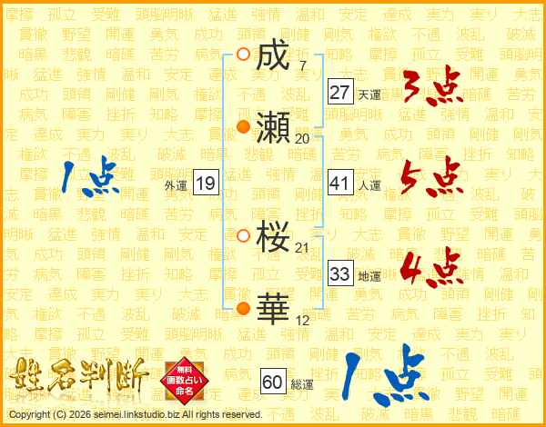 成(7画)瀬(20画) 桜(21画)華(12画)