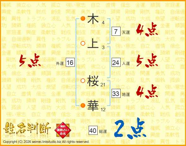 生活面を象徴する運勢です。外部から受ける影響力を表し、結婚運、家庭運や職場、環境への順応性を表します。総運から人運を引いた画数。姓や名が1文字の場合を除く。