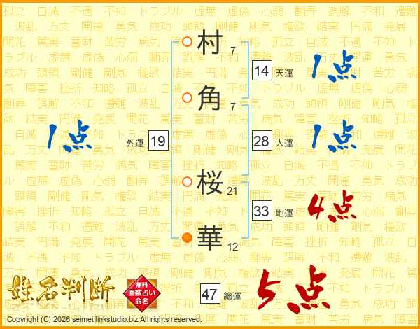 村(7画)角(7画) 桜(21画)華(12画)