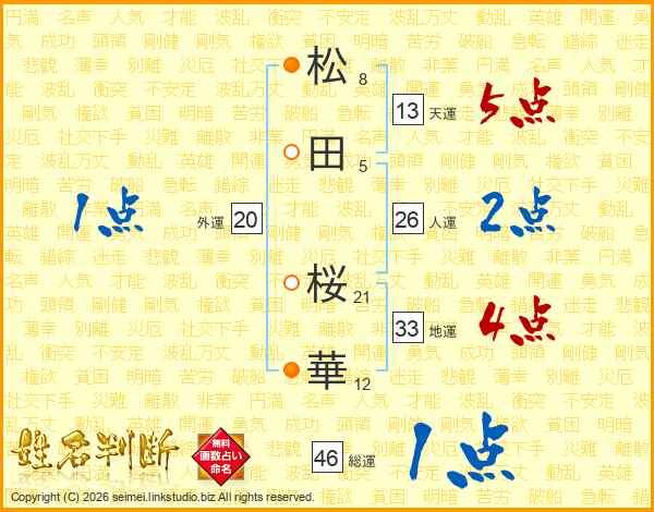 生活面を象徴する運勢です。外部から受ける影響力を表し、結婚運、家庭運や職場、環境への順応性を表します。総運から人運を引いた画数。姓や名が1文字の場合を除く。