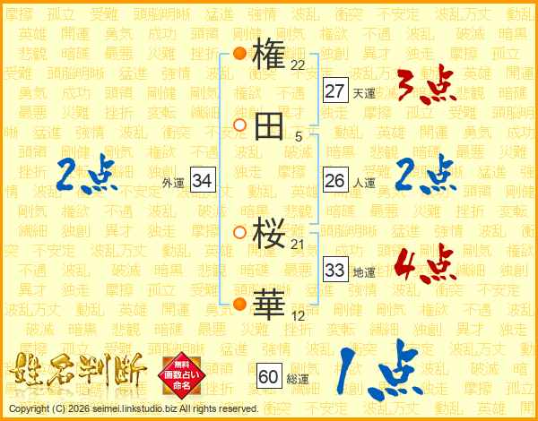 権(22画)田(5画) 桜(21画)華(12画)
