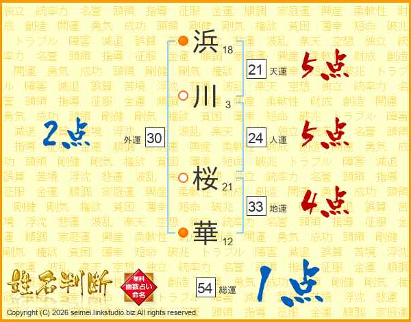 生活面を象徴する運勢です。外部から受ける影響力を表し、結婚運、家庭運や職場、環境への順応性を表します。総運から人運を引いた画数。姓や名が1文字の場合を除く。