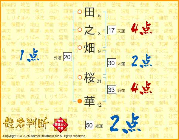 田(5画)之(3画)畑(9画) 桜(21画)華(12画)