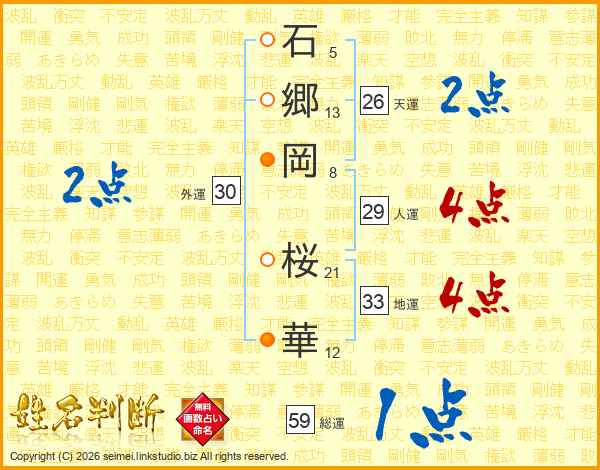 石(5画)郷(13画)岡(8画) 桜(21画)華(12画)