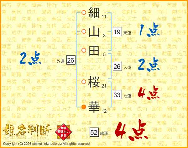 細(11画)山(3画)田(5画) 桜(21画)華(12画)