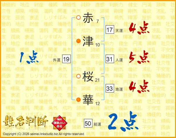 赤津桜華さんの人運は31画の5点!