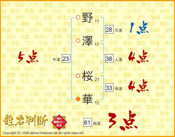 野(11画)澤(17画) 桜(21画)華(12画)