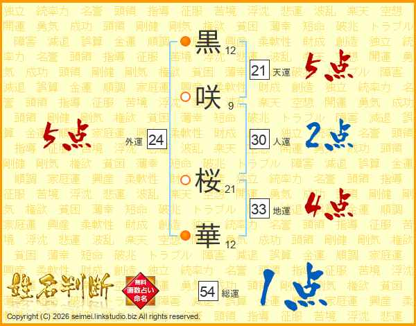 黒(12画)咲(9画) 桜(21画)華(12画)