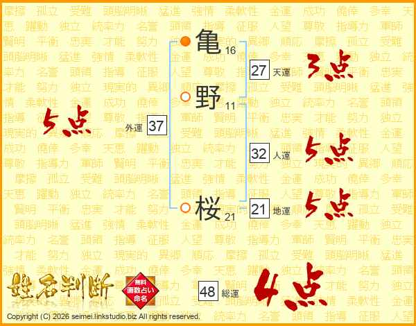 あなたの人生を表す1番重要な運勢です。生涯を通じて影響する総合運となり、主に50歳以降の晩年期に影響を及ぼします。苗字と名前の合計画数。
