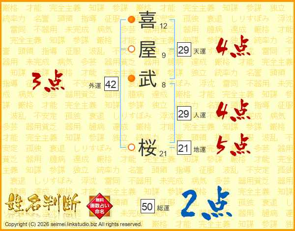 喜(12画)屋(9画)武(8画) 桜(21画)