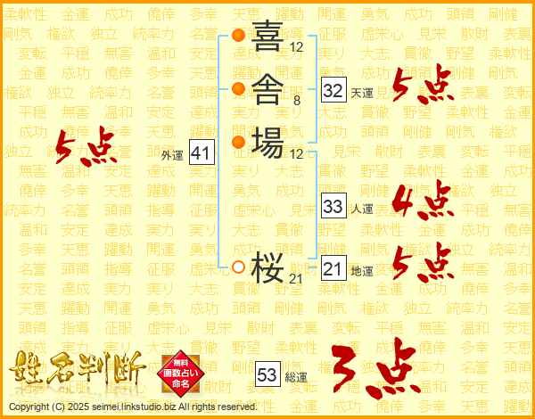 喜(12画)舎(8画)場(12画) 桜(21画)