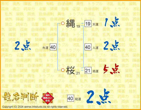 生活面を象徴する運勢です。外部から受ける影響力を表し、結婚運、家庭運や職場、環境への順応性を表します。総運から人運を引いた画数。姓や名が1文字の場合を除く。