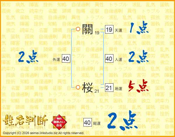 生活面を象徴する運勢です。外部から受ける影響力を表し、結婚運、家庭運や職場、環境への順応性を表します。総運から人運を引いた画数。姓や名が1文字の場合を除く。