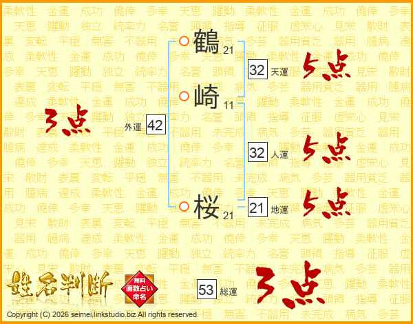 生活面を象徴する運勢です。外部から受ける影響力を表し、結婚運、家庭運や職場、環境への順応性を表します。総運から人運を引いた画数。姓や名が1文字の場合を除く。