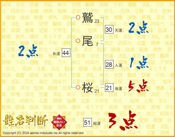 あなたの人生を表す1番重要な運勢です。生涯を通じて影響する総合運となり、主に50歳以降の晩年期に影響を及ぼします。苗字と名前の合計画数。