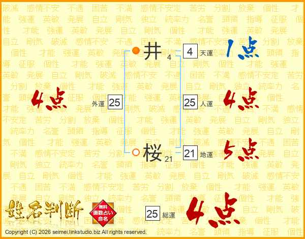生活面を象徴する運勢です。外部から受ける影響力を表し、結婚運、家庭運や職場、環境への順応性を表します。総運から人運を引いた画数。姓や名が1文字の場合を除く。