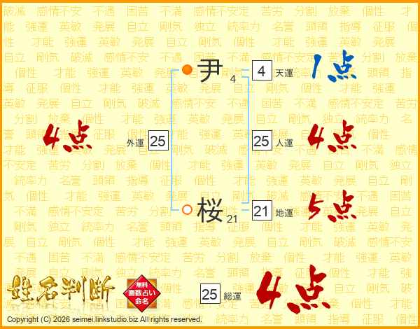 生活面を象徴する運勢です。外部から受ける影響力を表し、結婚運、家庭運や職場、環境への順応性を表します。総運から人運を引いた画数。姓や名が1文字の場合を除く。