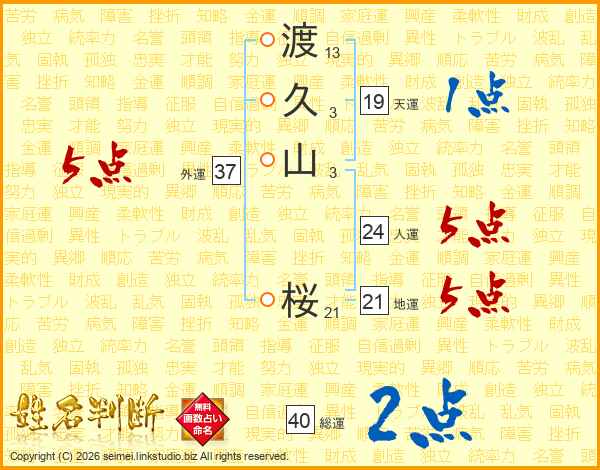 生活面を象徴する運勢です。外部から受ける影響力を表し、結婚運、家庭運や職場、環境への順応性を表します。総運から人運を引いた画数。姓や名が1文字の場合を除く。