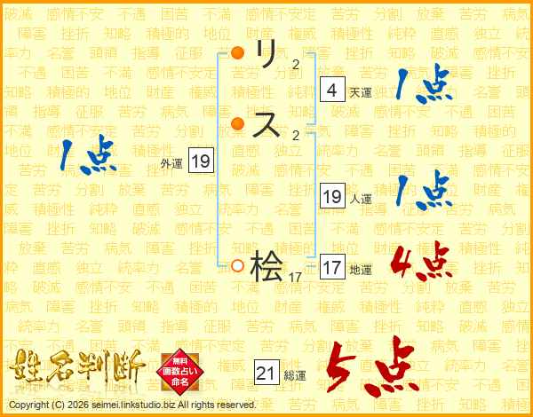 生活面を象徴する運勢です。外部から受ける影響力を表し、結婚運、家庭運や職場、環境への順応性を表します。総運から人運を引いた画数。姓や名が1文字の場合を除く。