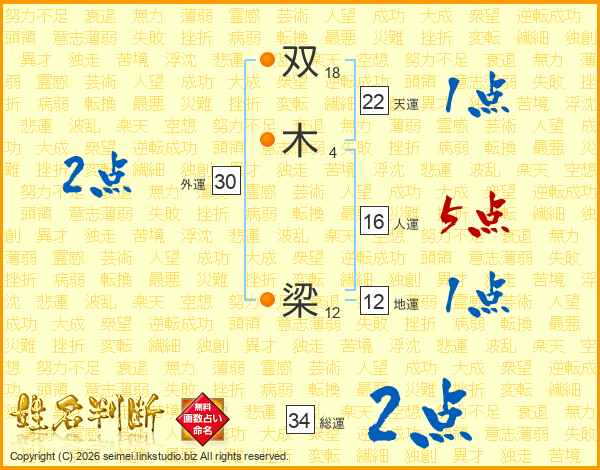 あなたの人生を表す1番重要な運勢です。生涯を通じて影響する総合運となり、主に50歳以降の晩年期に影響を及ぼします。苗字と名前の合計画数。