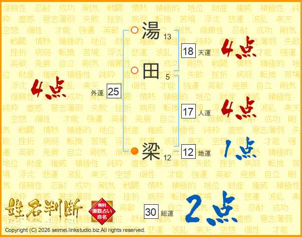 生活面を象徴する運勢です。外部から受ける影響力を表し、結婚運、家庭運や職場、環境への順応性を表します。総運から人運を引いた画数。姓や名が1文字の場合を除く。