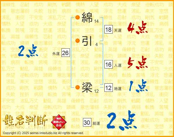 生活面を象徴する運勢です。外部から受ける影響力を表し、結婚運、家庭運や職場、環境への順応性を表します。総運から人運を引いた画数。姓や名が1文字の場合を除く。