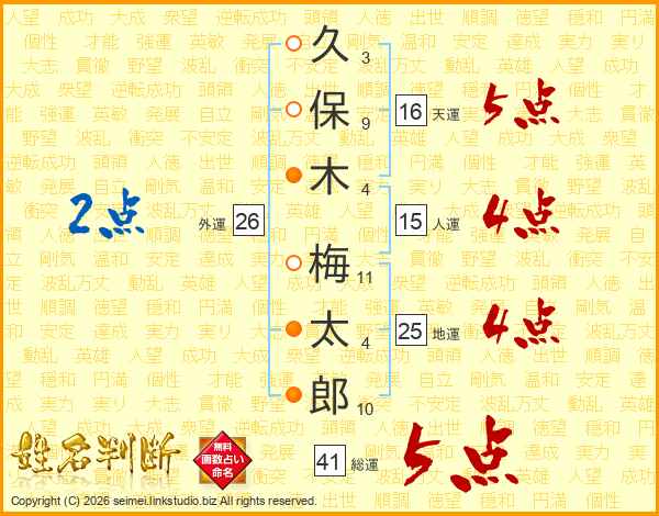 久(3画)保(9画)木(4画) 梅(11画)太(4画)郎(10画)