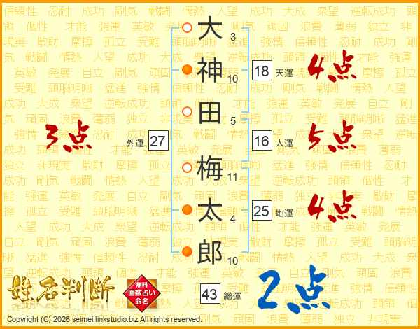大(3画)神(10画)田(5画) 梅(11画)太(4画)郎(10画)