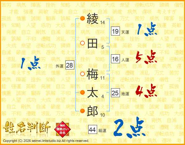 綾(14画)田(5画) 梅(11画)太(4画)郎(10画)