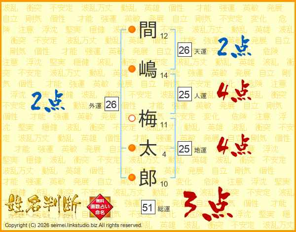 間(12画)嶋(14画) 梅(11画)太(4画)郎(10画)