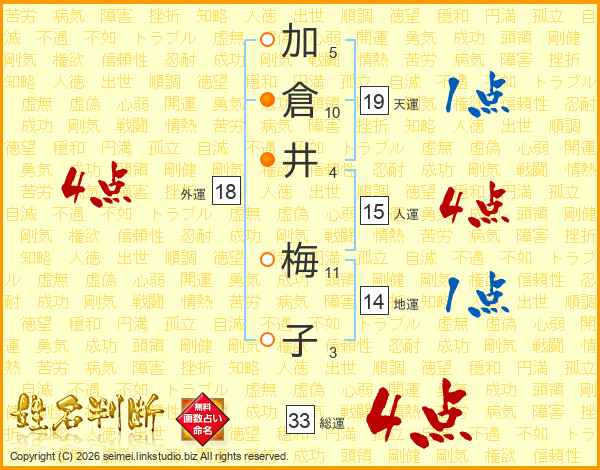 加倉井梅子さんの総運は33画の4点!