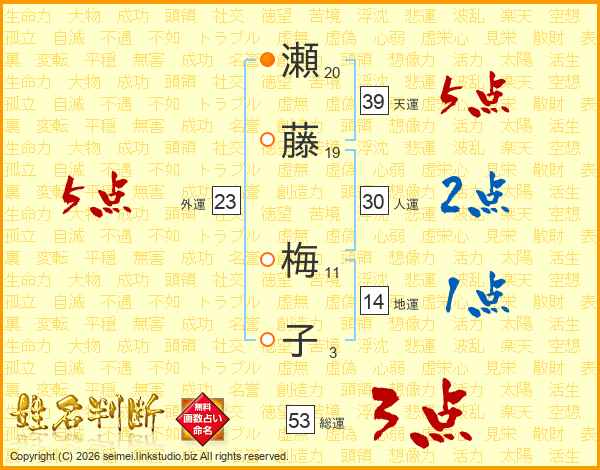 瀬(20画)藤(19画) 梅(11画)子(3画)