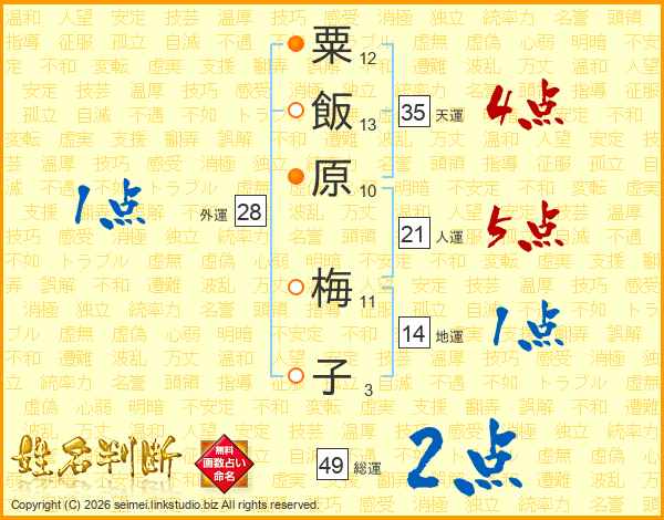 粟(12画)飯(13画)原(10画) 梅(11画)子(3画)