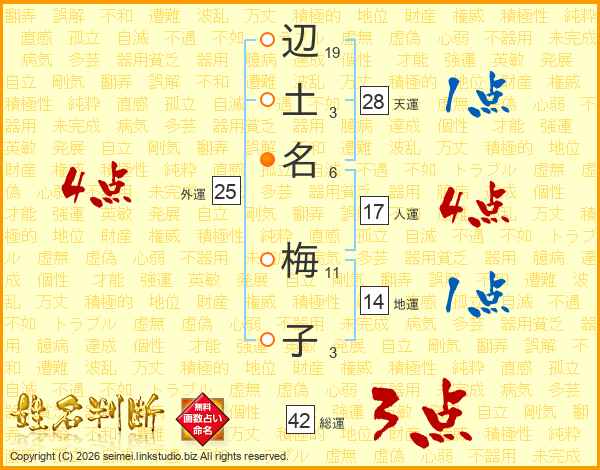 辺(19画)土(3画)名(6画) 梅(11画)子(3画)
