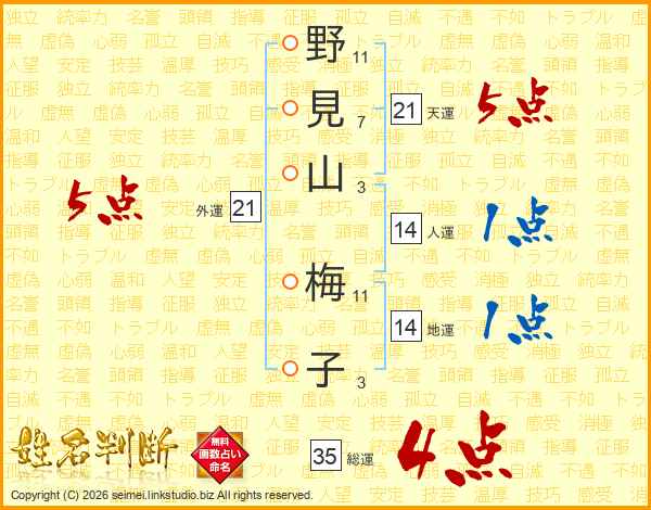 野(11画)見(7画)山(3画) 梅(11画)子(3画)