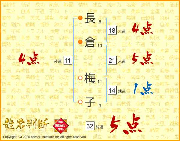 あなたの人生を表す1番重要な運勢です。生涯を通じて影響する総合運となり、主に50歳以降の晩年期に影響を及ぼします。苗字と名前の合計画数。