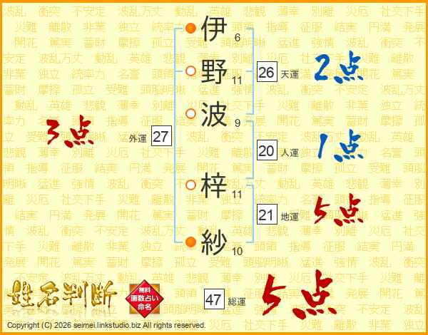 伊(6画)野(11画)波(9画) 梓(11画)紗(10画)
