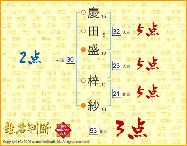 慶(15画)田(5画)盛(12画) 梓(11画)紗(10画)